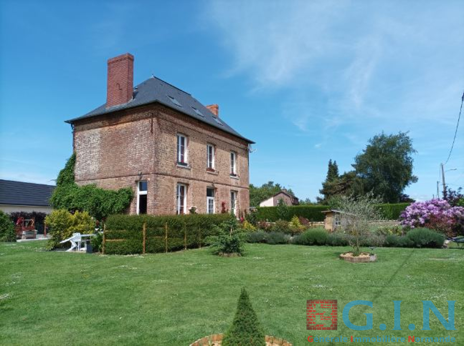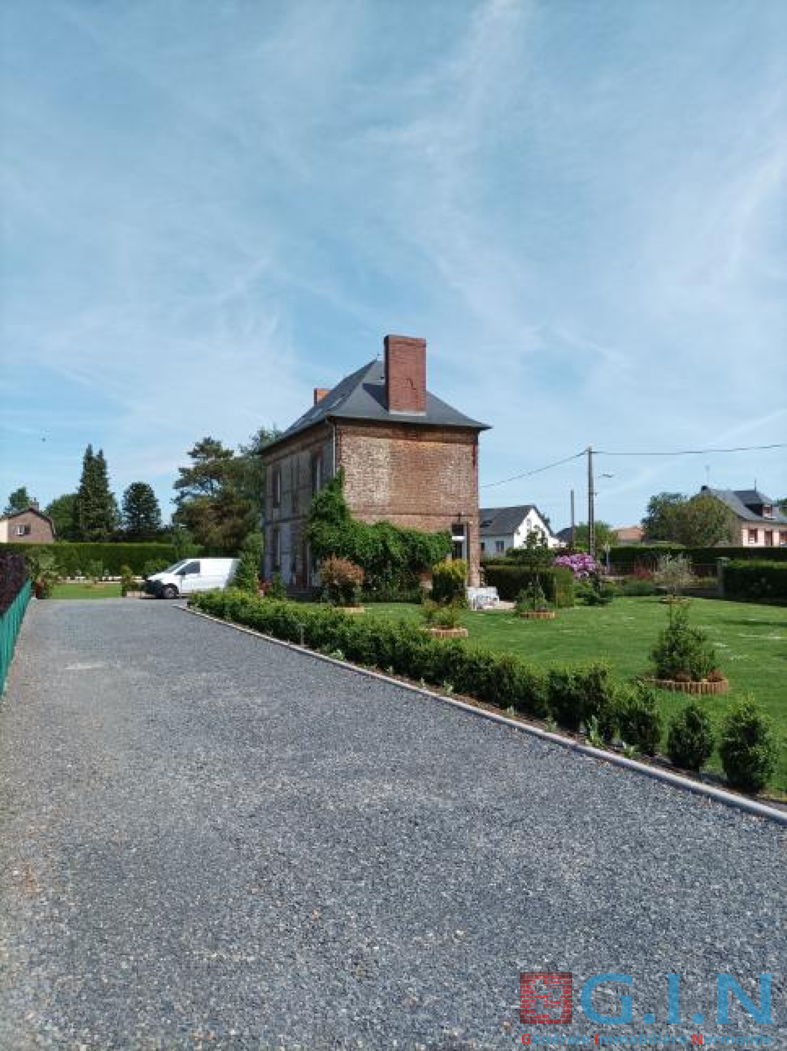 Le jardin paysager de 2700 m2 dispose d'une allée d'accès gravillonnée, d'un visiophone, d'un cabanon de jardin et d'une bûcherie.