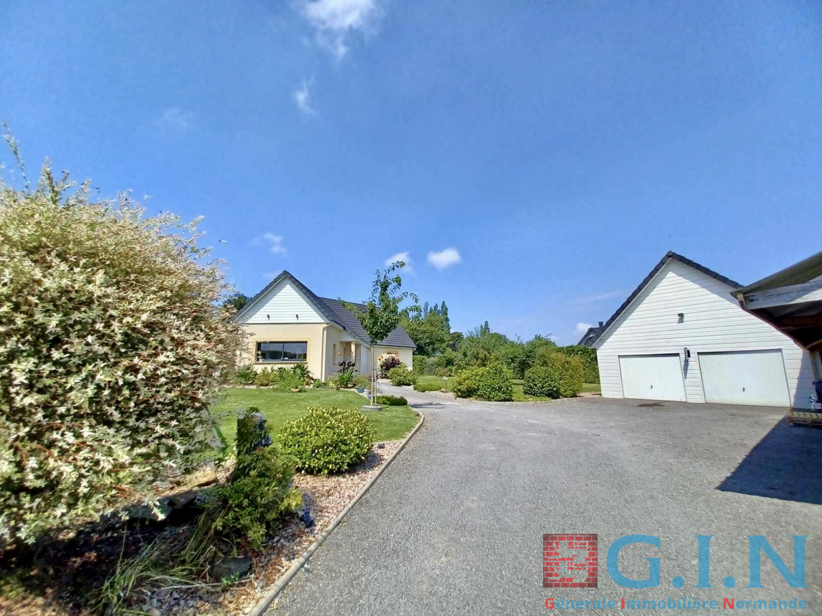 Terrain aménagé et arboré d'environ 1600 m² avec double garage, charretterie et portail motorisé.