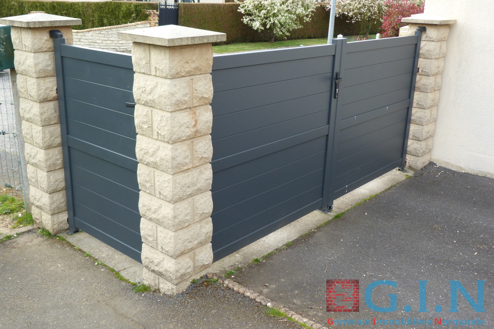 Portail avec portillon récent en alu gris anthracite