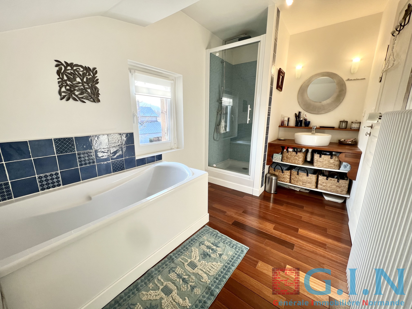 Au 1er étage : Chambre / salle de bains avec douche, baignoire et wc / palier et pièce de rangement