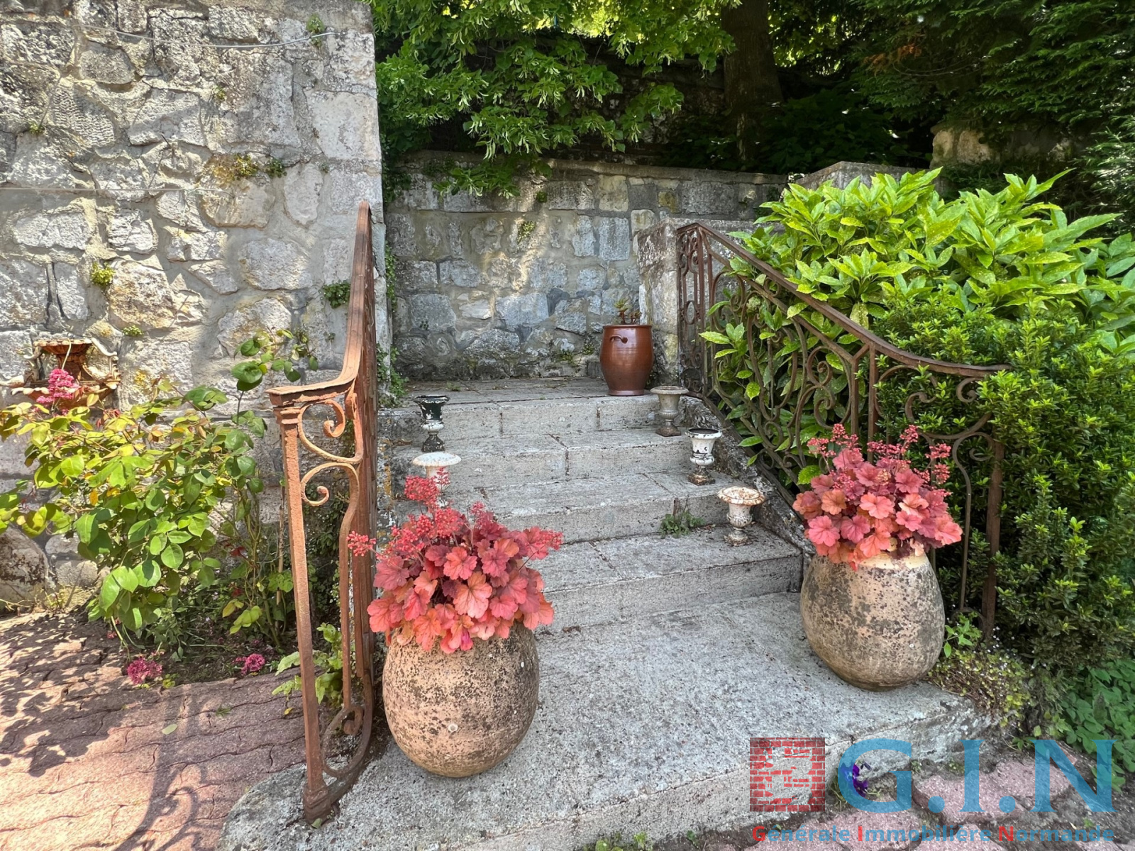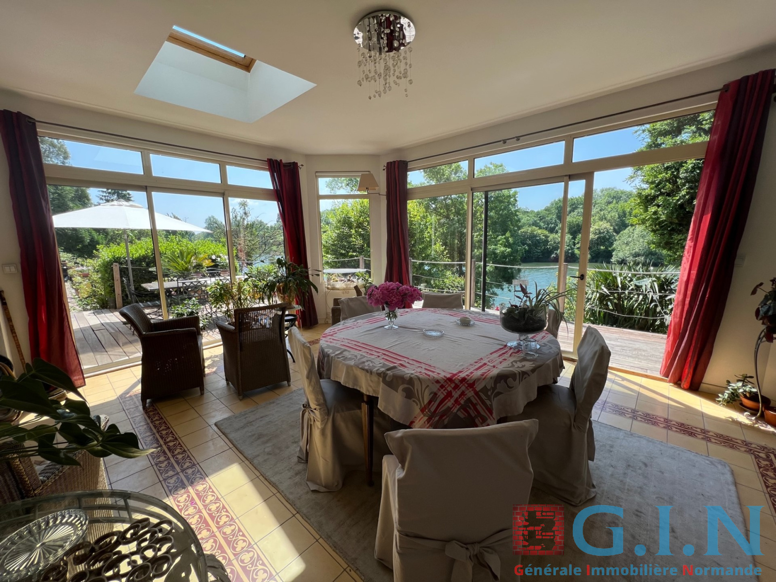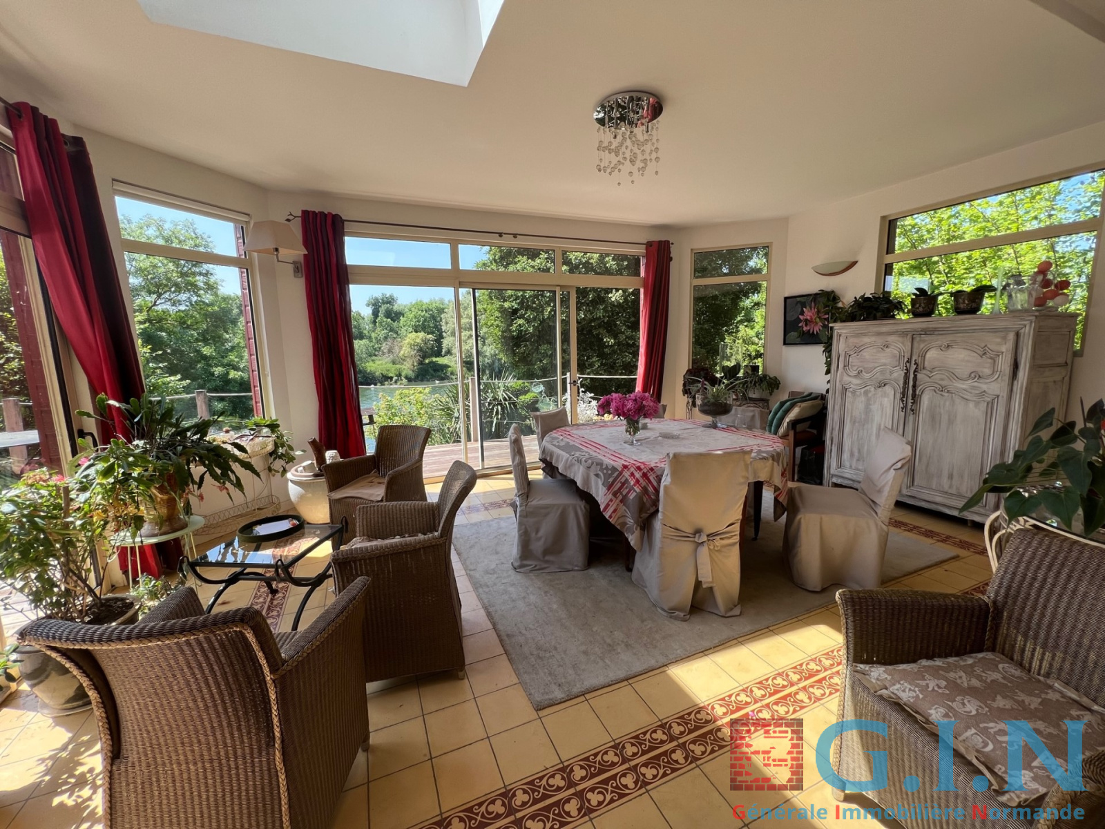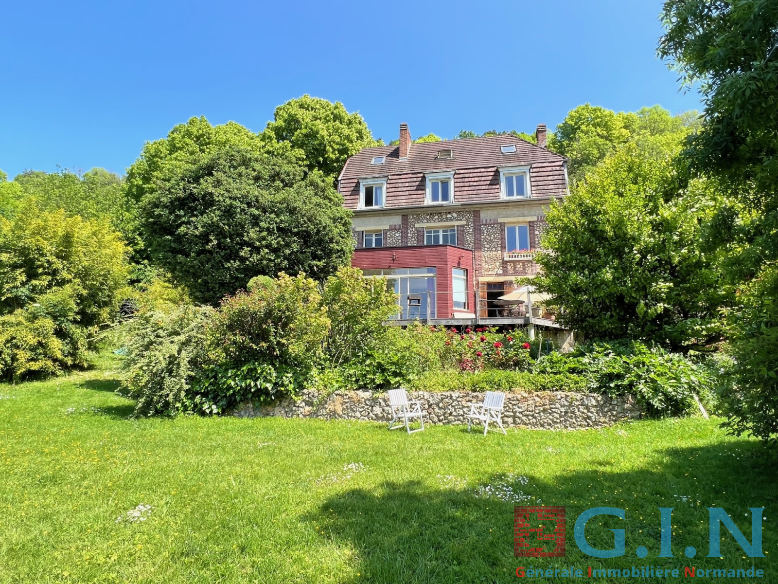 -Rez-de-jardin : entrée, salon avec cheminée à foyer ouvert, salon avec grande baie vitrée donnant sur terrasse bois, très beau jardin avec jolie vue sur la Seine, cuisine aménagée et équipée, arrière-cuisine, wc, réserve, cave à vins