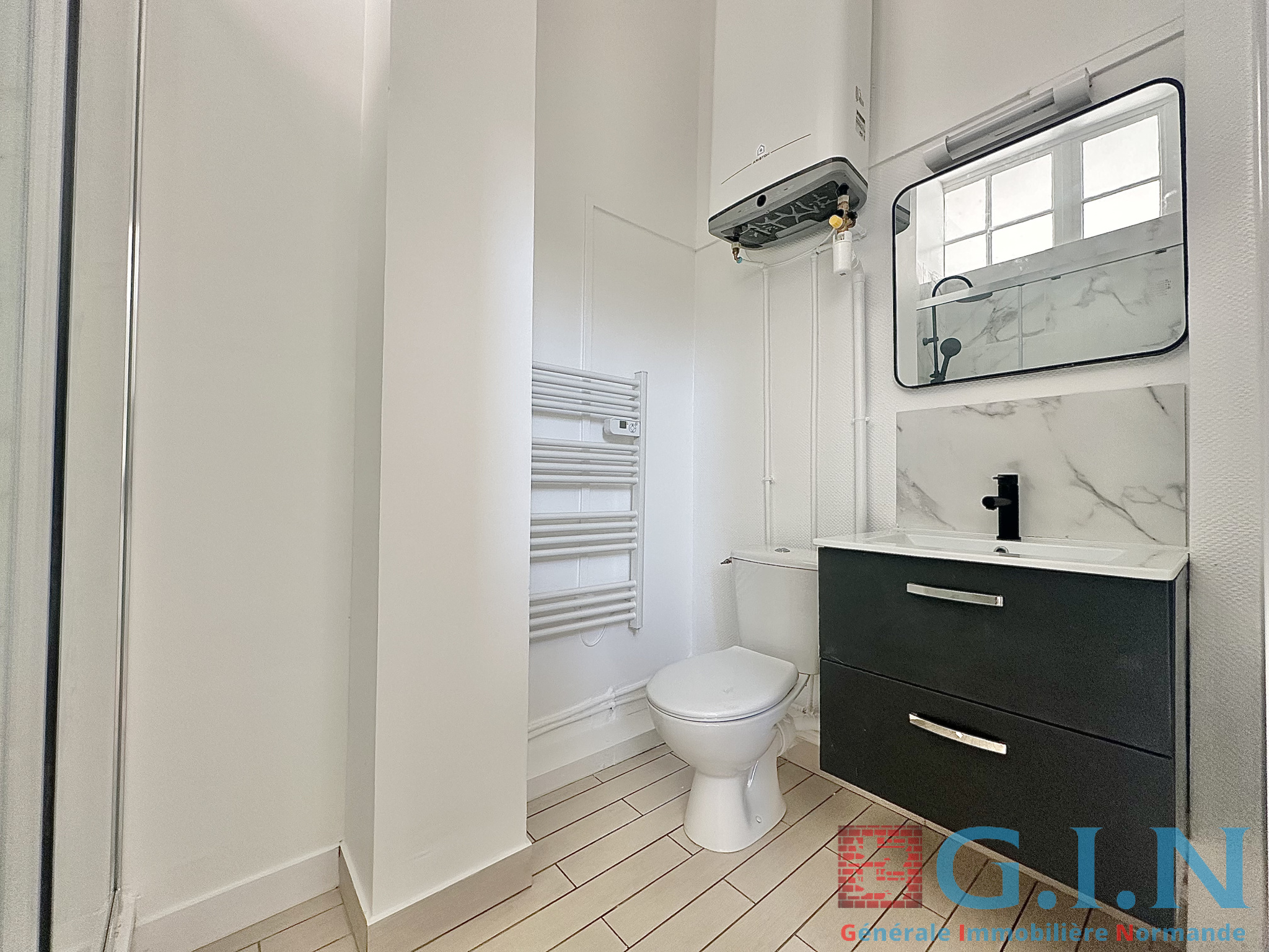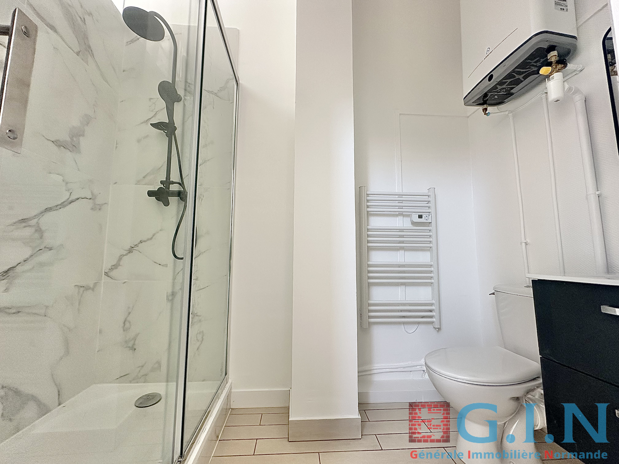 -Salle de bains avec douche, meuble vasque, wc ainsi qu'un sèche serviettes
