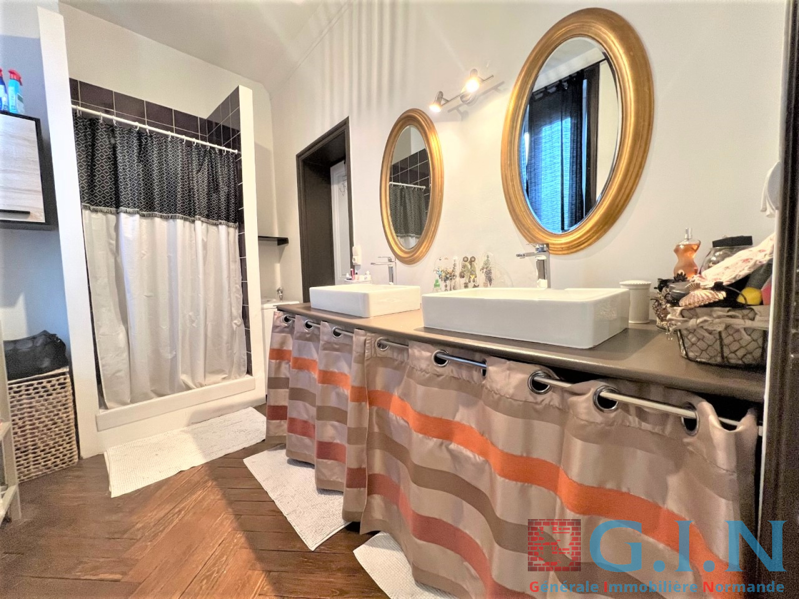- Salle de bains avec douche, double vasque et emplacement machine à laver