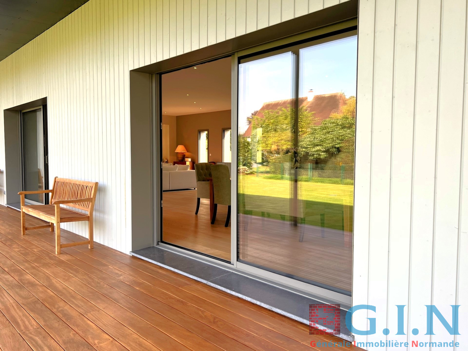 L'ensemble de la pièce de vie s'ouvre par de larges baies vitrées sur une terrasse couverte de 55,38m² en bois exotique type "Cumaru"