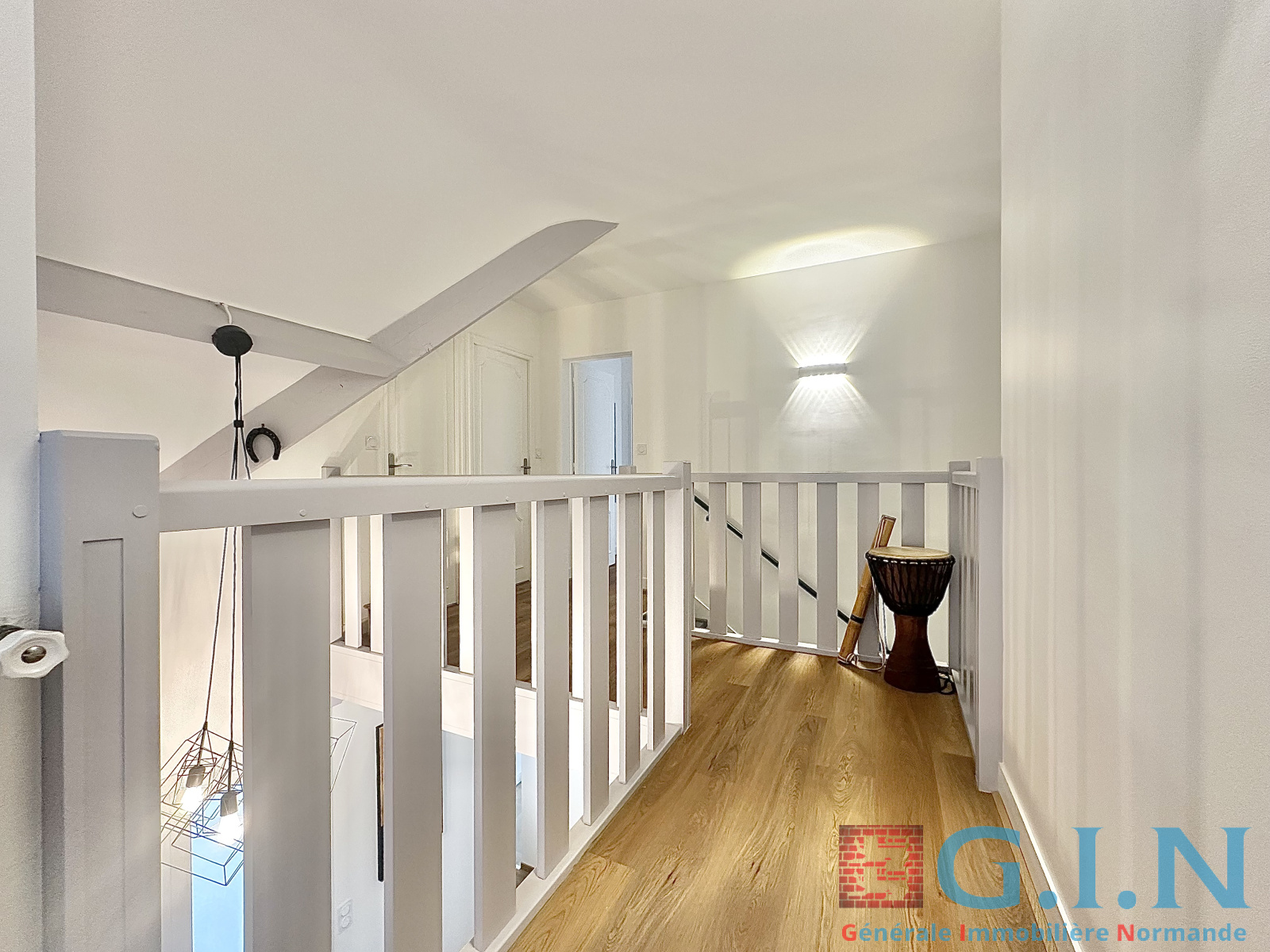 Un bel escalier mène à une passerelle distribuant les espaces nuit :
