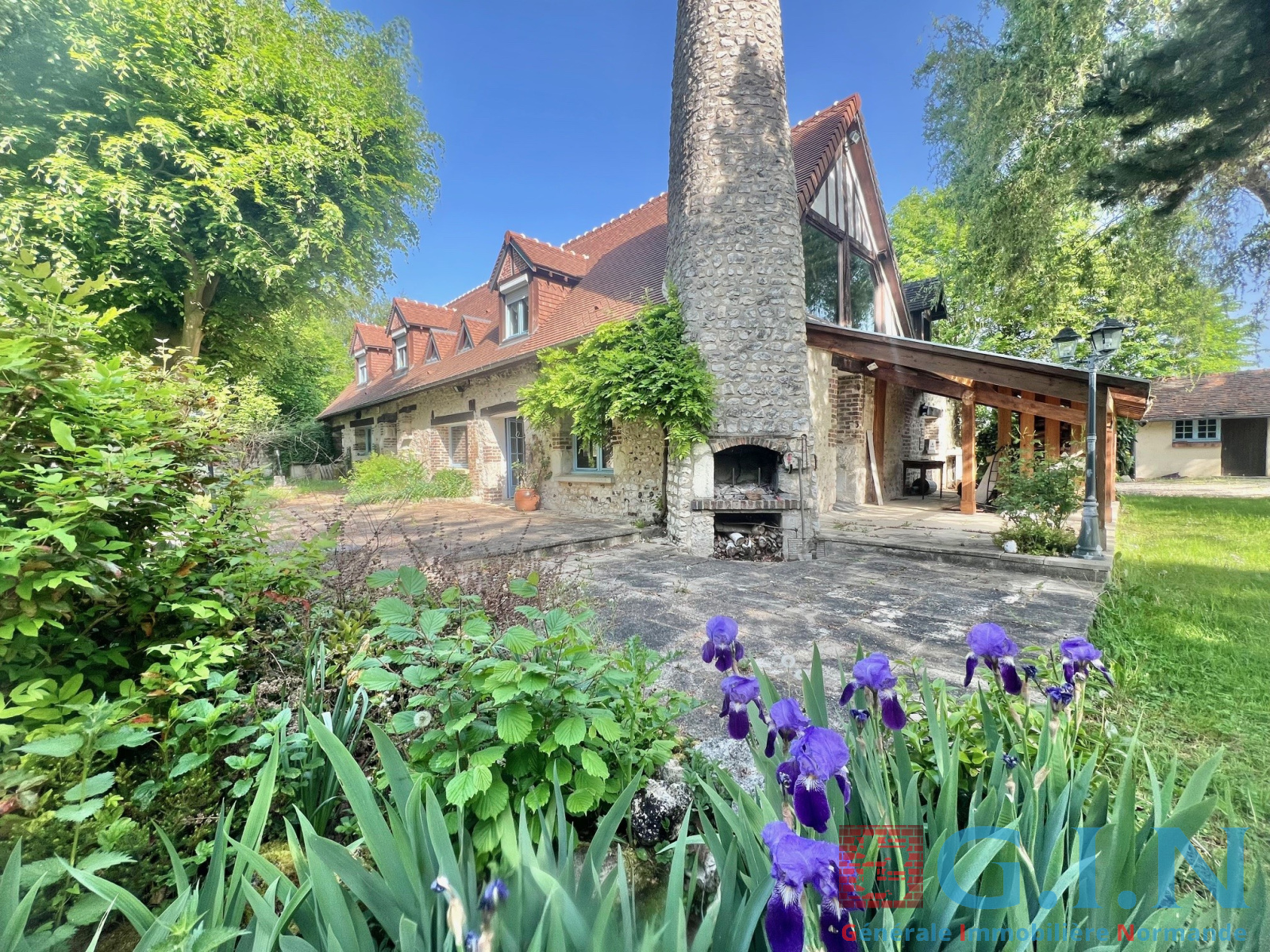 -Maison principale en moellons et couverte en Tuiles plates Normandes d'une superficie de 183m² au sol comprenant au rez-de-chaussée : une entrée, grande pièce de réception d'une superficie de 75m² avec grande cheminée à foyer ouvert, cuisine aménagée et équipée, bureau en mezzanine (chambre possible), salle de bains, wc, arrière-cuisine avec chaufferie et laverie / à l'étage : palier distribuant deux chambres d'enfants en enfilade, grande chambre principale, salle de bains avec wc / cave à vins / belle terrasse en pierre / abri bois