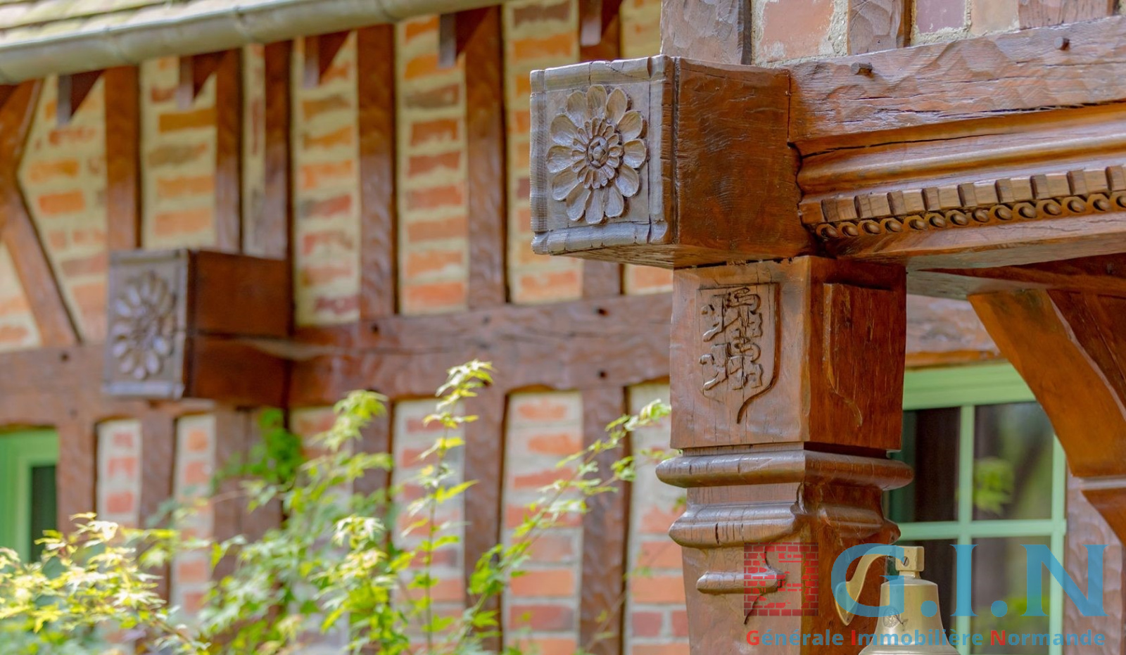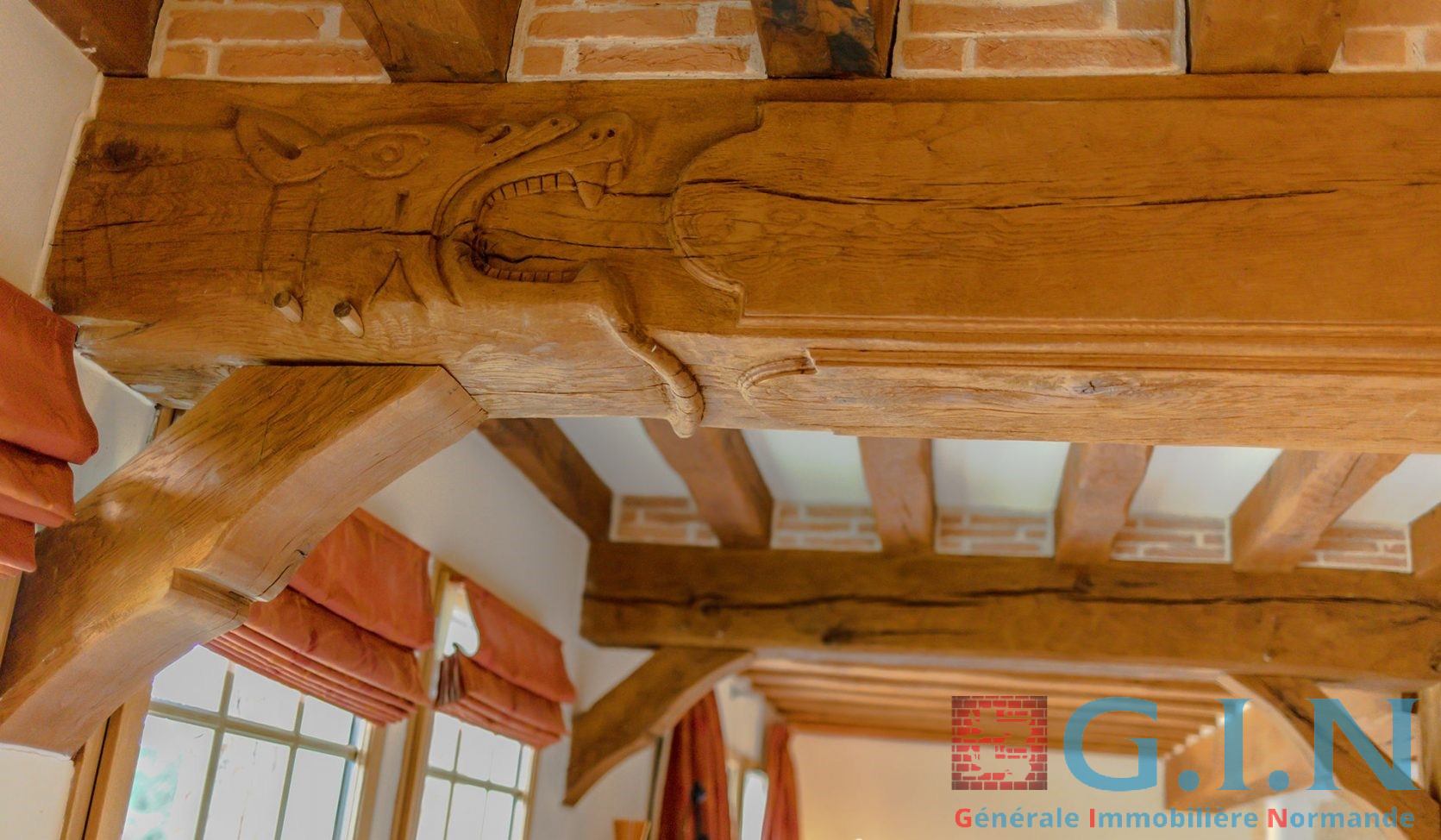 Dès l’extérieur, le ton est donné : une magnifique façade en briques et poutres en chêne, sublimée par ses soubassements en silex, sous son auvent une magnifique porte d’entrée est encadrée de deux poteaux en chêne massif moulurés. Les détails raffinés tel que les gouttières en cuivre et menuiseries bois/aluminium renforcent le caractère unique de la demeure.