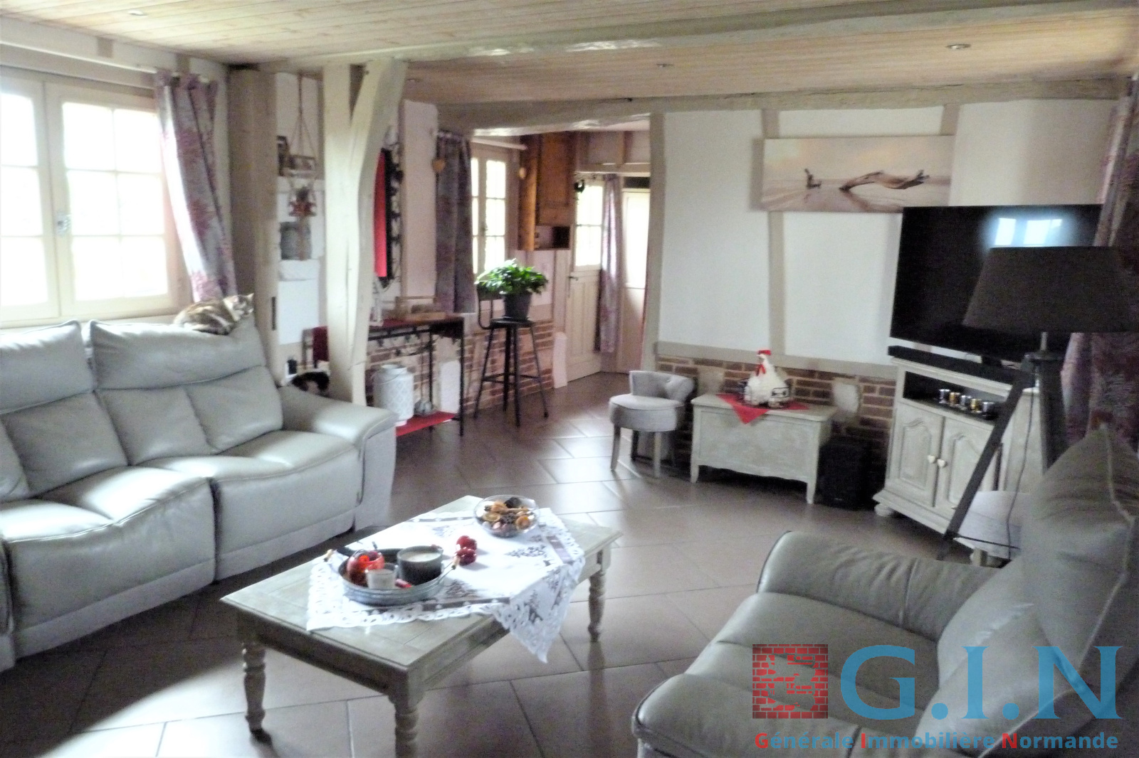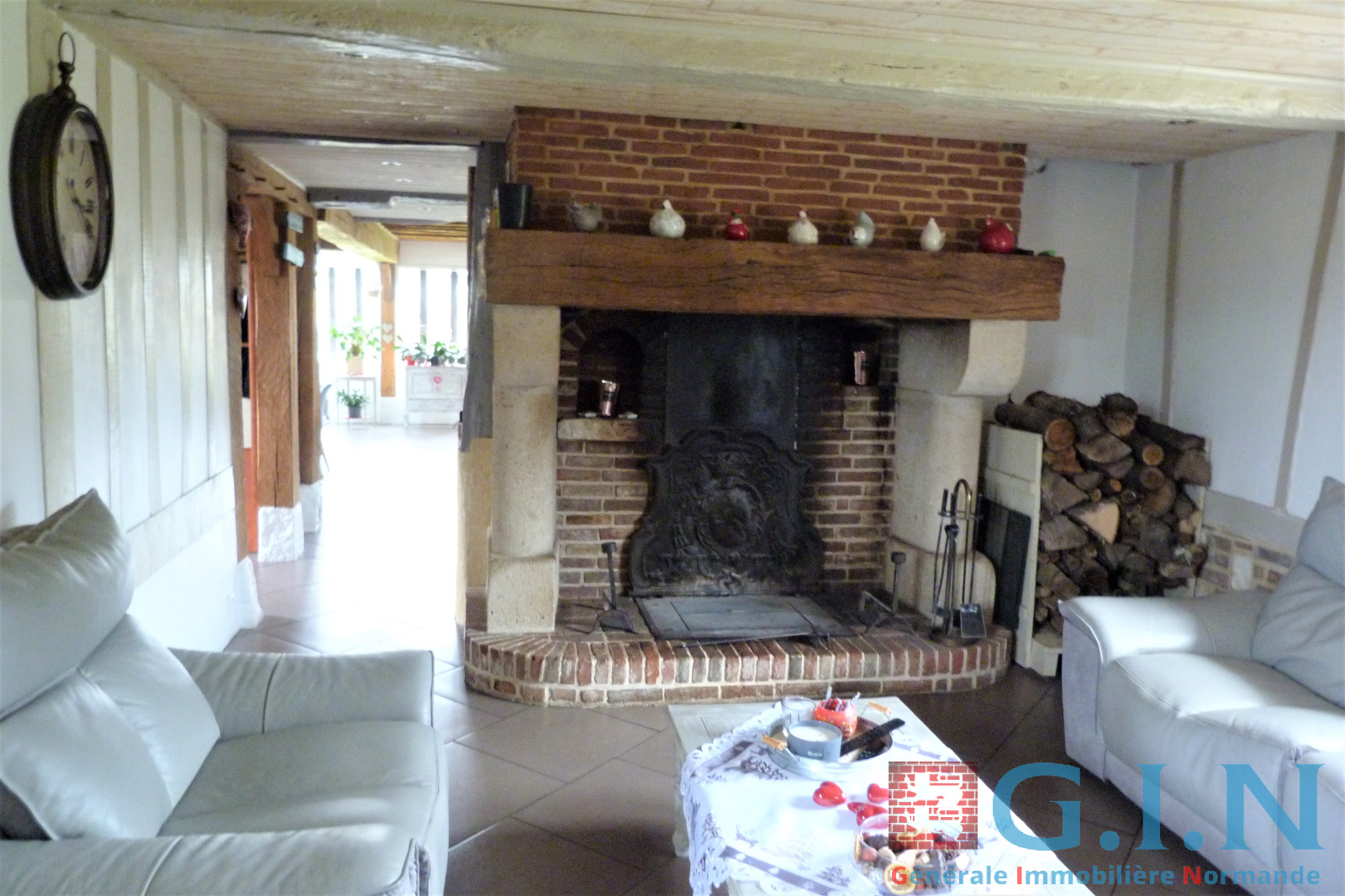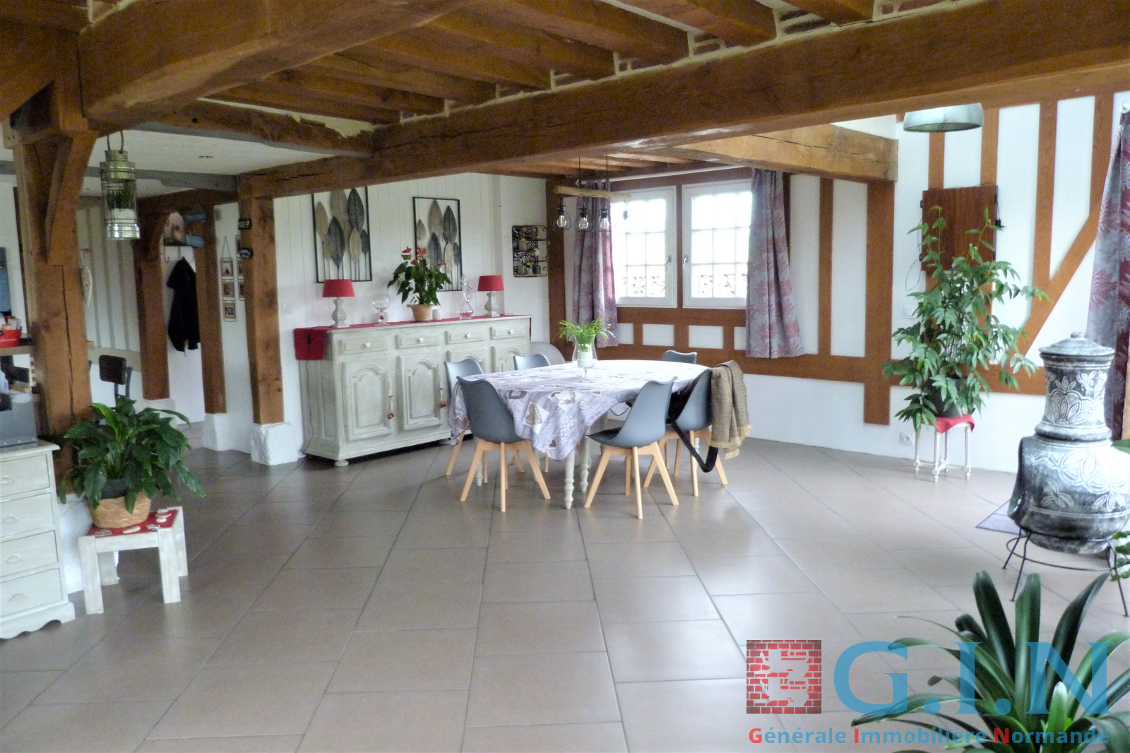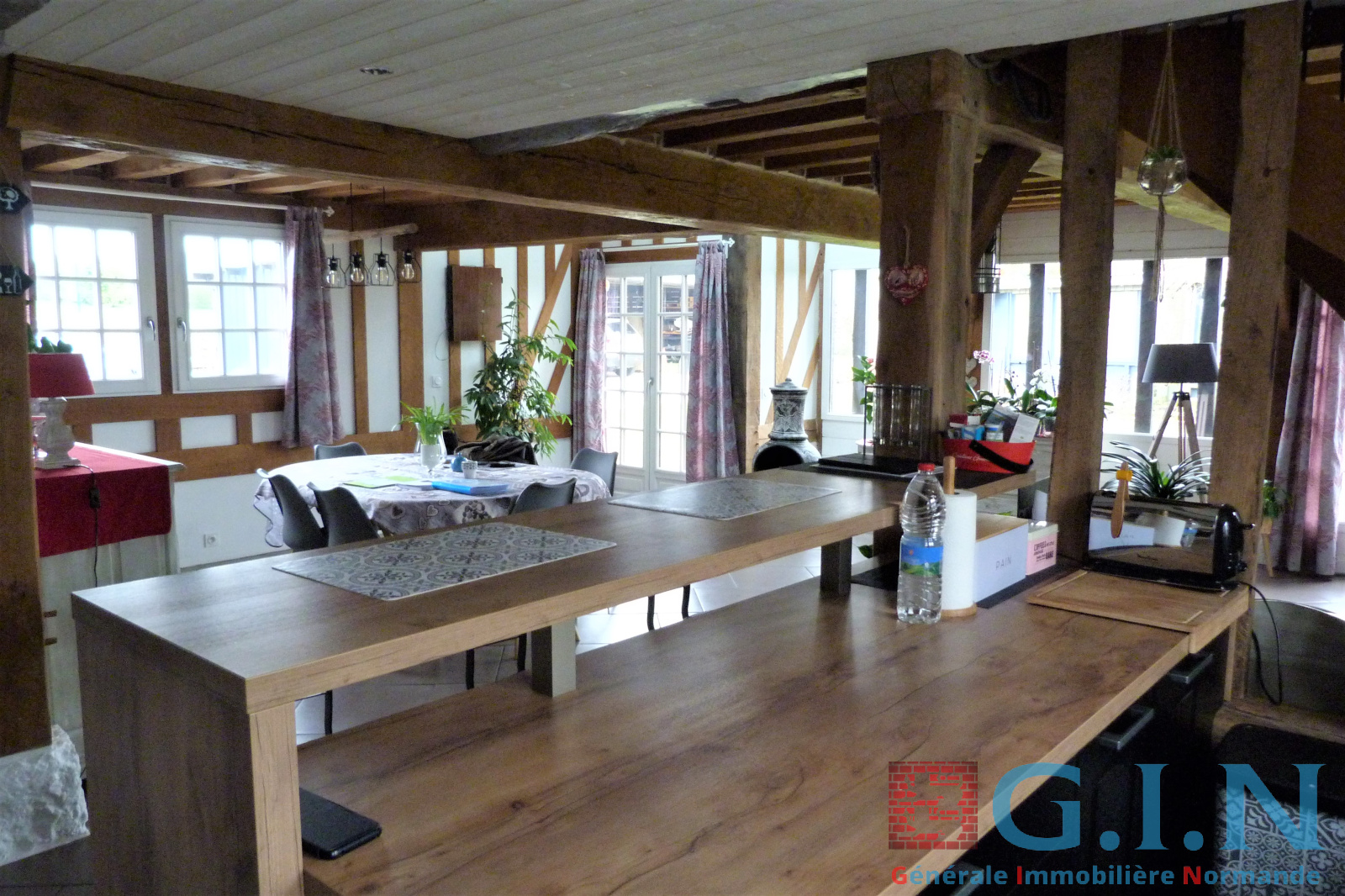 - Cuisine aménagée et équipée récente et moderne/salle à manger avec bow-window, partie plafond cathédrale et puits de lumière avec beaux sommiers chêne au plafond et colombages/Séjour-salon avec cheminée à l'âtre "Magnan" (avec pierres taillées) : 87m² le tout.