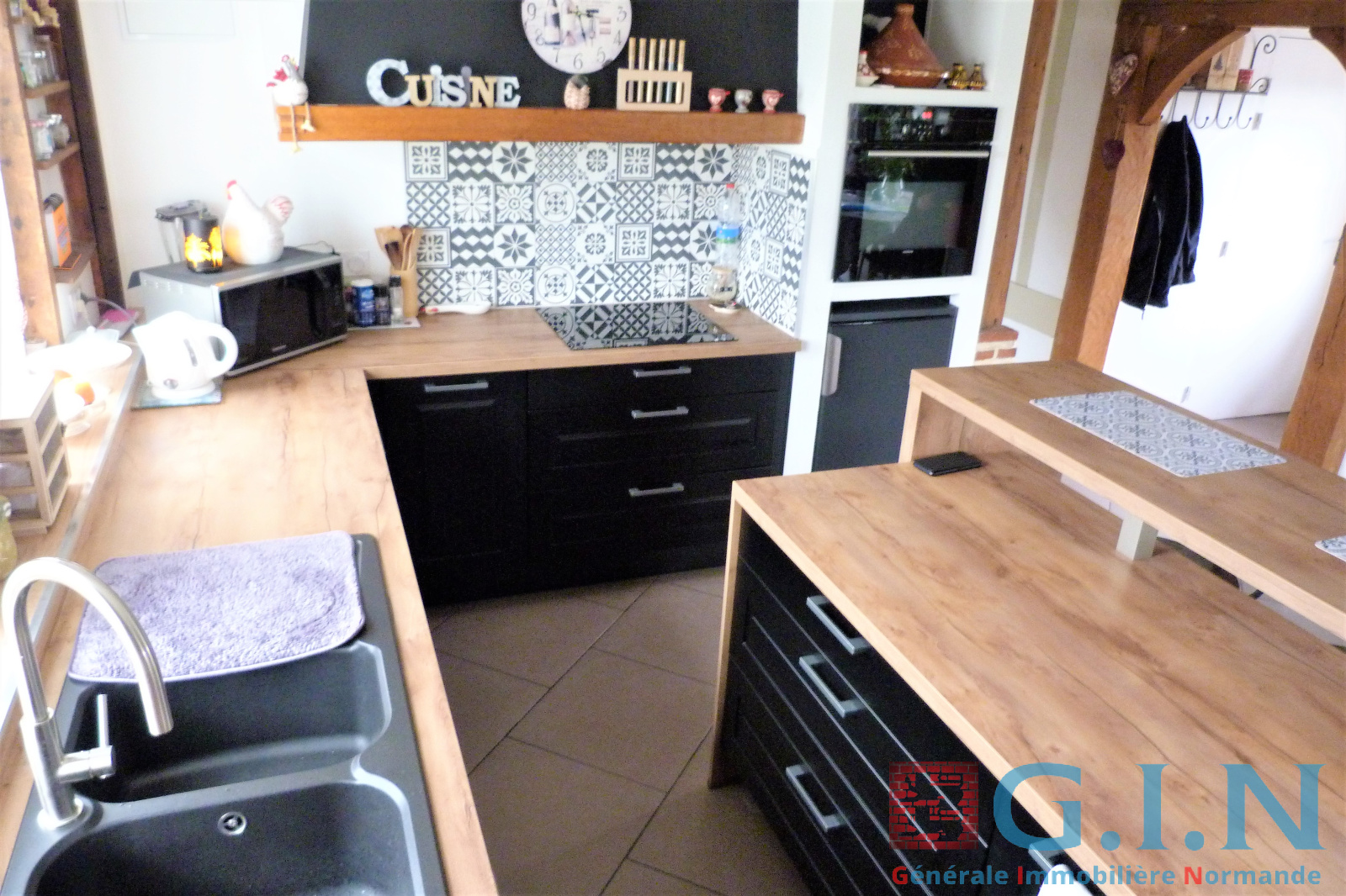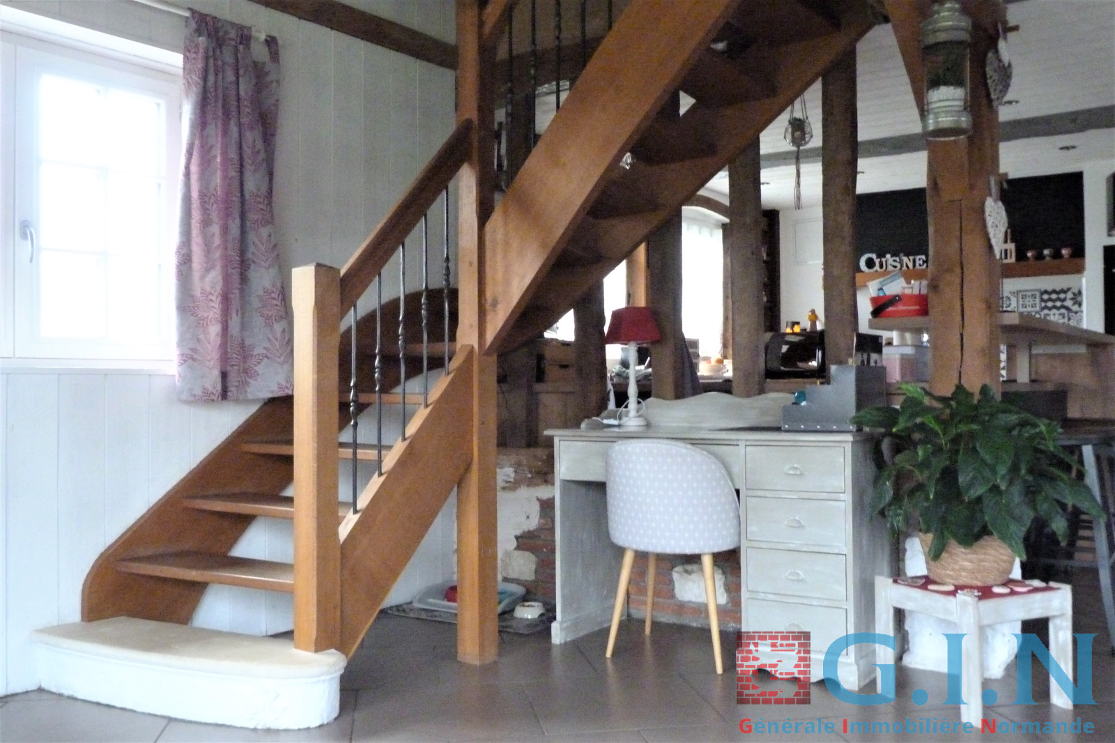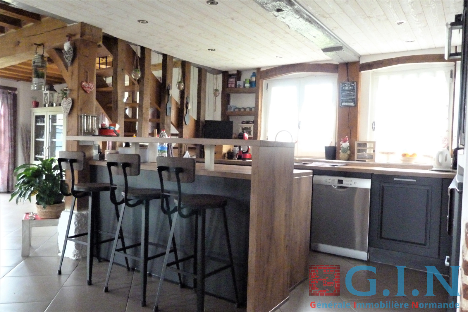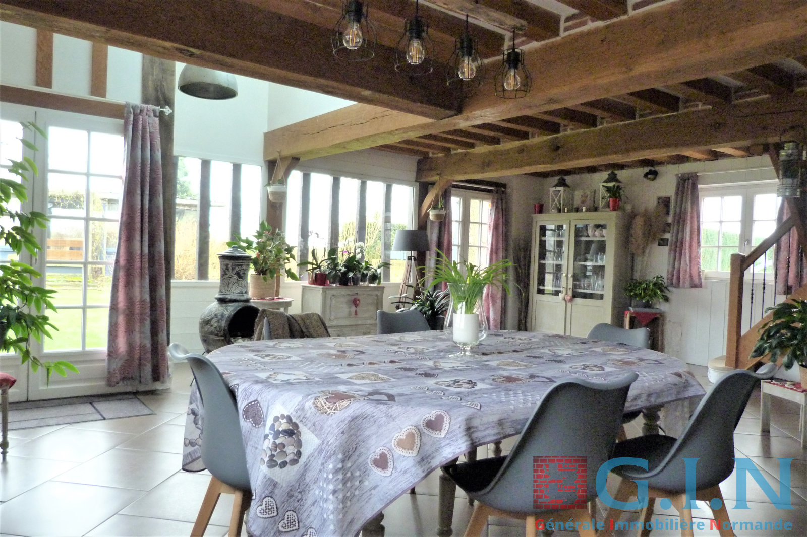 - Cuisine aménagée et équipée récente et moderne/salle à manger avec bow-window, partie plafond cathédrale et puits de lumière avec beaux sommiers chêne au plafond et colombages/Séjour-salon avec cheminée à l'âtre "Magnan" (avec pierres taillées) : 87m² le tout.
