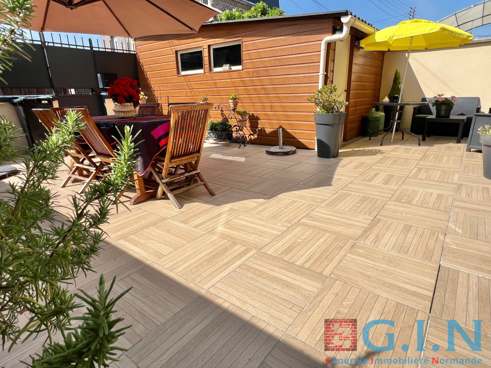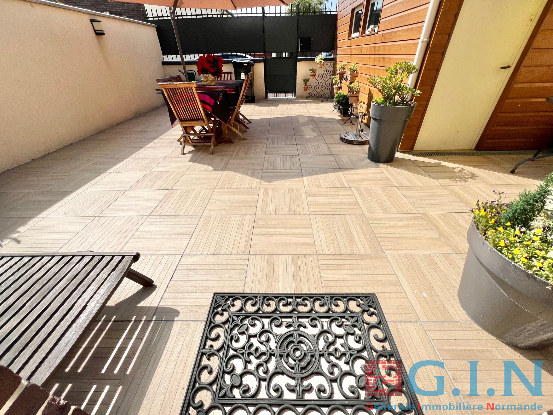 Spacieuse terrasse carrelée, idéale pour les apéros au soleil ou les soirées d’été