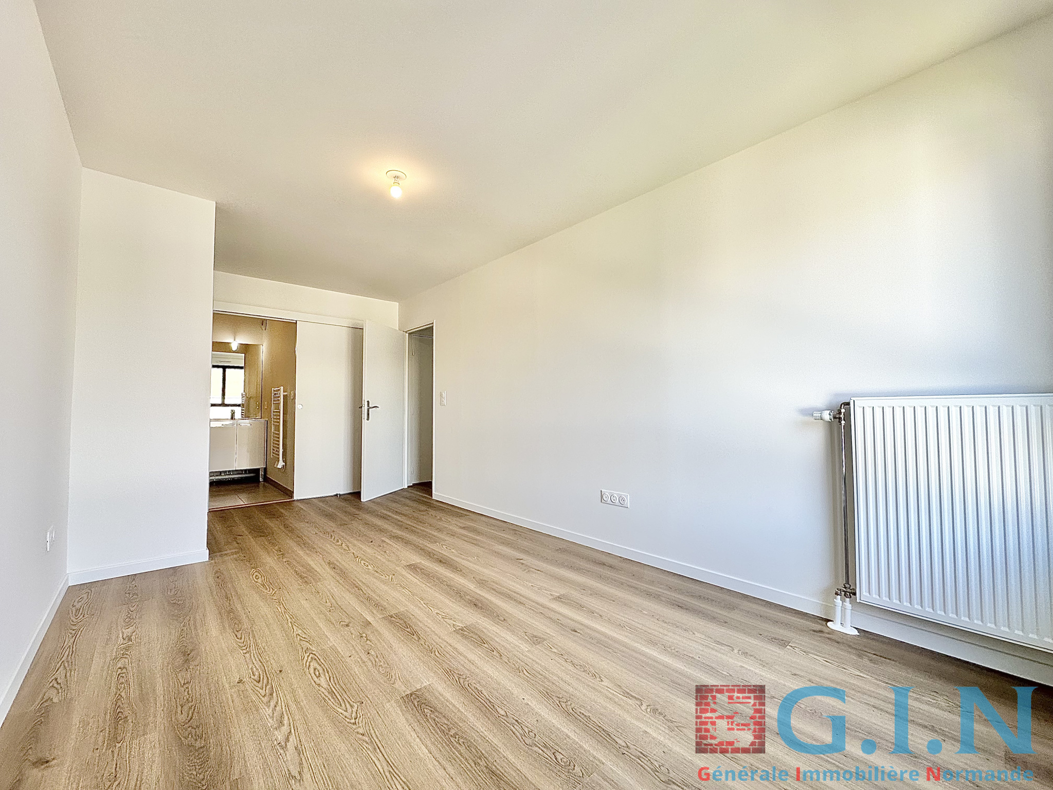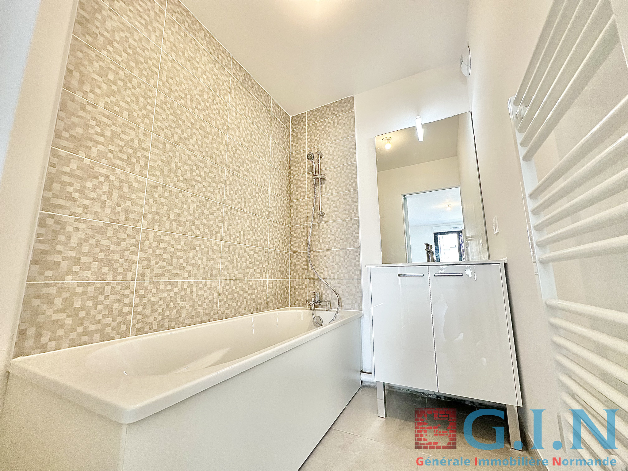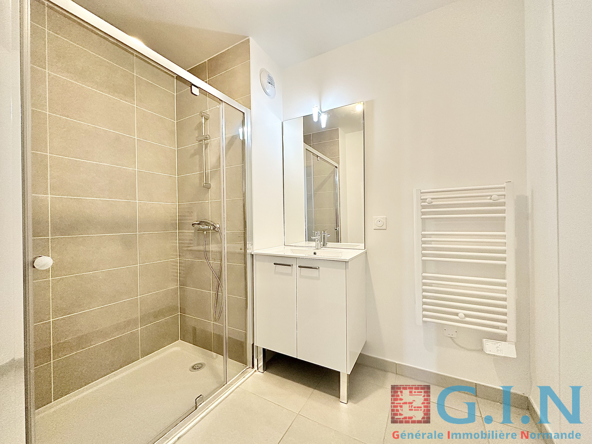 L’appartement comprend également une salle de bains équipée d’une douche à l'italienne, d’un meuble vasque et d'un sèche serviette, ainsi qu’un WC indépendant.